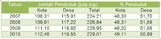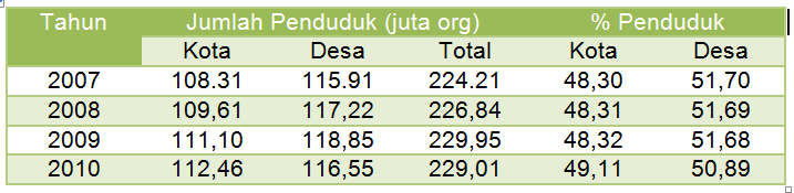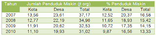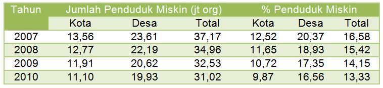 Namun demikian, data kemiskinan yang dipublikasikan oleh BPS per Juli 2010 lalu menunjukkan jumlah penduduk miskin di Indonesia mencapai 13,33 % dari totalitas jumlah penduduk (lihat tabel 3). Untuk desa sendiri – angka kemiskinan tersebut mencapai 10,56 %; bandingkan dengan kota, yang hanya sebesar 9,87 %. Artinya, kumulatif angka kemiskinan didominasi oleh penduduk miskin yang ada di desa. Angka kemiskinan diukur secara makro atas dasar pengeluaran/pendapatan rumah tangga – komposisi distribusi lainnya tidak dipertimbangkan (lihat Hal Hill, 2002; 258). Apabila dirunut lebih lanjut, tanpa mempertimbangkan kemahalan harga (inflasi), maka indikasi kemiskinan lebih banyak ditentukan keterbatasan penyerapan tenaga kerja di desa, walaupun pada tabel 2 sebelumnya menunjukan sektor pertanian paling banyak menyerap tenaga kerja. Mengingat, tenaga kerja yang terserap tidak selalu bekerja penuh waktu, banyak diantaranya bekerja paruh waktu atau musiman, dengan upah yang relatif kecil, tidak mampu memenuhi kebutuhan hidup layak – dibawah pendapatan minimal, sehingga dikategorikan miskin.