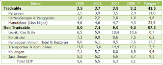 Pertumbuhan ekonomi Indonesia pada tahun 2010 yang mencapai 6,1 %, demikian pula pada tahun-tahun sebelumnya menunjukkan pertumbuhan positif diatas rata-rata pertumbuhan ekonomi dunia (lihat tabel 4). Namun pertumbuhan tersebut lebih ditopang oleh peningkatan konsumsi masyarakat, bukan sebaliknya ditopang oleh tingkat investasi. Kondisi demikian terjadi, karena struktur PDB yang ada lebih didominasi oleh berkembangnya sektor ekonomi berbasis jasa (non tradeable).