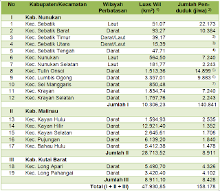 1) Luas wilayah daratan; 2) Hasil Sensus Tahun 2010; 3) Data jumlah penduduk masih masuk Kec. Sebatik; 4) Data jumlah penduduk masih masuk Kec. Sebatik & Sebatik Barat; 5) Data jumlah penduduk masih mencakup Kec. Sebuku (sebelum pemekaran); 6) Data jumlah penduduk masih mencakup Kec. Lumbis (sebelum pemekaran); 7) Data jumlah penduduk masih masuk Kec. Nunukan (sebelum pemekaran).