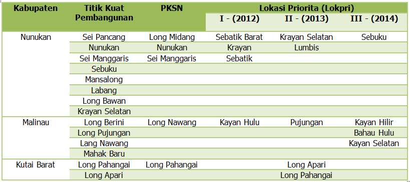 Dalam RPJMD Provinsi Kalimantan Timur 2009 – 2013, disebutkan bahwa strategi perwilayah pembangunan di kawasan perbatasan, dengan cara menetapkan 14 titik kuat pembangunan, dimana beberapa titik (“lokasi”) kuat dimaksud tidak termasuk dalam kategori kawasan perbatasan. Namun, keberadaannya sangat mendukung pembangunan kawasan di perbatasan melalui pengembangan prasarana/sarana transportasi yang terkoneksikan dengan baik, terutama transportasi darat.