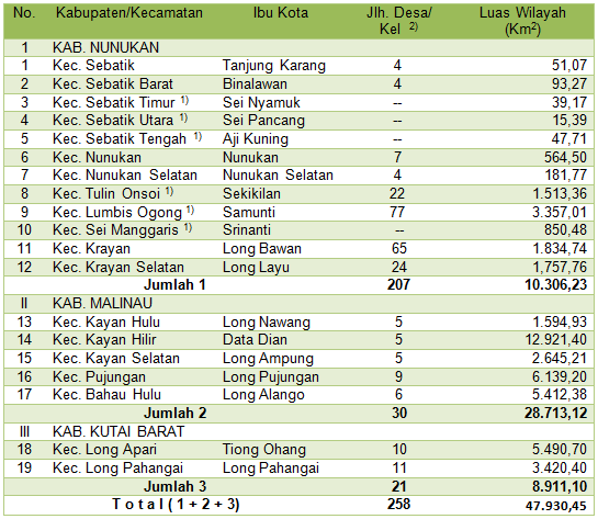 2) Jumlah Desa masih merujuk pada jumlah Desa sebelum ada pemekaran di Kabupaten Nunukan (jumlah pasti masih dihimpun).