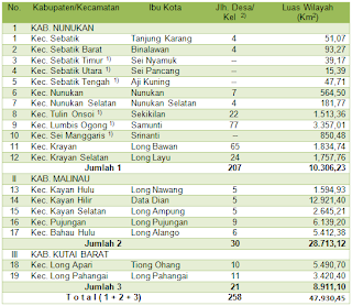 Sumber : Grand Strategi Pengelolaan Kawasan Perbatasan Kalimantan Timur 2010, publikasi Badan Pengelola Kawasan Perbatasan, Pedalaman & Daerah Tertinggal (BPKP2DT) Provinsi Kaltim, diolah dengan menambahkan data dari sumber lainnya.
