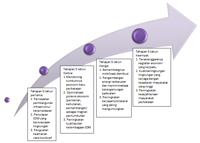 e. Sasaran 5 tahunan pada setiap tahapnya merupakan batu loncatan untuk mencapai sasaran tahap berikutnya; Pada tahapan ke-4, diharapkan dapat mencapai sasaran meningkatkatnya kesejahteraan masyarakat perbatasan.