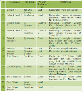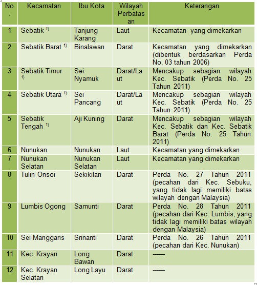 1) Kecamatan hasil pemekaran baru pada tahun 2011, Sebatik dipecah menjadi 5 Kecamatan (sebelumnya 2 Kecamatan, yaitu Kecamatan Sebatik dan Sebatik Barat). Kecamatan Lumbis Ogong adalah pemekaran dari Kecamatan Lumbis, sedangkan Kecamatan Tullin Onsoi, merupakan pemekaran dari Kecamatan Sebuku. Kecamatan Sei Manggaris marupakan pemekaran dari Kecamatan Nunukan.