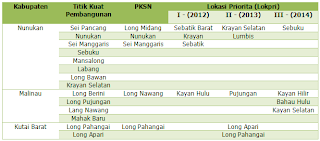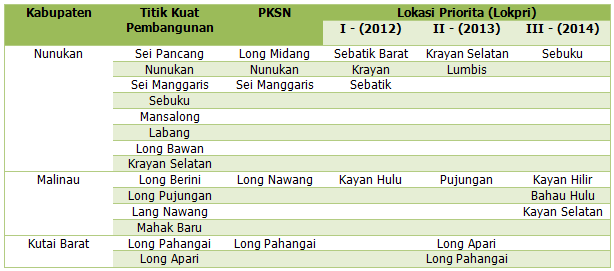 Dari ke-15 Kecamatan yang ada (sebelum dimekarkan), telah ditetapkan sebagai Lokpri hanya 13 Kecamatan, karena Kecamatan Nunukan dan Nunukan Selatan sudah dianggap lebih maju pencapaian hasil-hasil pembangunannya. Implementasi strategi perwilayahan menurut Lokpri ini, dengan cara menetapkan tahapan penanganan pembangunan pada setiap tahun (lihat Tabel 2), selama tahun 2012 – 2014; lebih terkesan sebagai “pemerataan” pembangunan. Setiap Lokpri sesuai dengan tahapannya akan mendapatkan alokasi dana proporsional, sesuai dengan potensi pengembangannya.