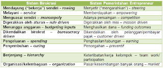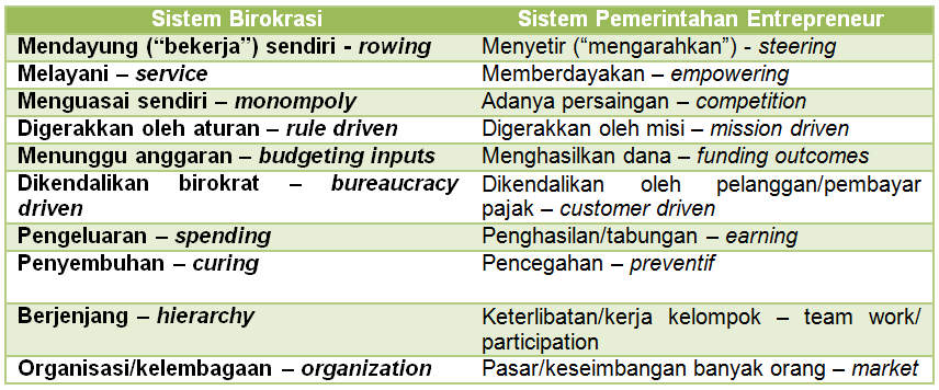 Dari banyak pemikiran untuk mengatasi hal tersebut, salah satunya merujuk pada langkah-langkah reformasi mendasar yang diajukan oleh David Osborne dan Ted Gaebler (1999), dimana reformasi yang relevan untuk dibahas lebih lanjut adalah menjadikan Pemerintahan yang Kompetitif – Orientasi pada Persaingan Kedalam Pemberian Pelayanan & Berjiwa Entrepreneur, dimana perbedaan dengan sistem birokrasi adalah sebagai berikut :