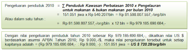 Bertambahnya jumlah penduduk di Kecamatan perbatasan berpengaruh terhadap akumulasi peningkatan pengeluaran rata-rata perkapita untuk makanan dan bukan makanan. Sebagai contoh – nilai kebutuhan bahan makanan dan bukan makanan tersebut pada tahun 2010 (merujuk hasil sensus penduduk 2010, jumlah penduduk di kawasan perbatasan Kalimantan Timur berjumlah 151.051 jiwa), maka dengan jumlah pengeluaran sebesar Rp 540.207,-/orang/bulan; didapatkan nilai pengelauaran sebesar Rp 81.598.807.557,-/bulan; atau dalam satu tahun jumlahnya akan mencapai Rp 979.185.690.684, sehingga dikonversikan dalam nilai US $ (asumsi APBN Tahun 2010 sebesar Rp 9.000.-/US $) – akan didapatkan hasil setara US $ 720.28/orang/bulan (bandingkan dengan Appendix 2 – memperhitungkan inflasi)