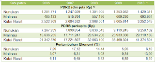 Pada Tabel 2 dapat dilihat bahwa selama kurun waktu 2006 – 2011 PDRB ketiga Kabupaten tadi meningkat signifikan – laju pertumbuhan ekonomi untuk Kabupaten Nunukan selama kurun waktu tersebut rata-rata 10,00 %/tahun, sedangkan untuk Kabupaten Malinau dan Kutai Barat, masing-masing mencapai prorata 8,13 %/tahun dan 6,48 %/tahun. Dikaitkan dengan perkembangan jumlah penduduk (lihat Tabel 2), maka pendapatan perkapita yang dicapai selama kurun waktu yang sama mengalami peningkatan – merujuk pada pendapat Budiono; memberikan gambaran bahwa ketiga Kabupaten perbatasan pertumbuhan ekonomi-nya cukup baik – dipertegas oleh Kuznet (dalam Lincolin Arsyad, 2010; 278); pengalaman dari Negara maju sebelumnya – salah satu dari 6 (enam) kharakteristik pertumbuhan ekonomi, dapat dilihat dari variabel ekonomi agregatif, yaitu tingginya tingkat pertumbuhan output perkapita dan penduduk. Pendapatan perkapita secara riil (setelah diperhitungkannya inflasi) mencerminkan kekuatan tawar dari pendapatan nominal, sehingga ini dapat menjadi indikator kesejahteraan (Tulus T.H. Tambunan, 2011, 56), walaupun tingkat kesejahteraan penduduk dikaitkan dengan pendapatan perkapita (ôdalam jumlah yang relatif samaö) dapat saja berbeda, karena dipengaruhi oleh; (a) perbedaan pola konsumsi masyarakatnya; (b) perbedaan iklim; dan (c) struktur produksi nasional (Lincolin Arsyad, 2010; 35-36).