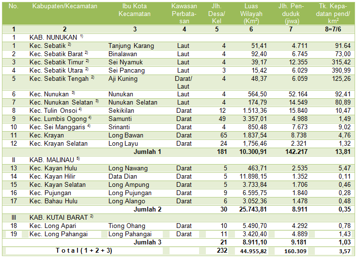 Di Kalimantan Timur, wilayah perbatasannya dengan Malaysia adalah sepanjang 1.038 km, yaitu dari Kabupaten Kutai Barat, Malinau hingga Nunukan – mencakup luas wilayah ▒ 44.955,82 km2, dimana didalamnya mencakup 19 Kecamatan (lihat Tabel 1), dengan melintasi perbatasan Negeri Sarawak dan Sabah, baik dari darat maupun laut. Namun pada saat kesepakatan BTA Tahun 1970 ditetapkan; baru dicapai kesepakatan (berdasarkan BCA Tahun 1967) – kawasan lintas batasnya (ôaccess of areaö) secara definitif adalah; (a) Di laut, berada di Nunukan – Tawao; dan (b) Di darat, berada di Simanggaris – Serudong dan Long Midang – BaÆKelalan; untuk kawasan lainnya dapat ditetapkan kemudian atas persetujuan kedua belah pihak.