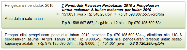 Bertambahnya jumlah penduduk di Kecamatan perbatasan berpengaruh terhadap akumulasi peningkatan pengeluaran rata-rata perkapita untuk makanan dan bukan makanan. Sebagai contoh – nilai kebutuhan bahan makanan dan bukan makanan tersebut pada tahun 2010 (merujuk hasil sensus penduduk 2010, jumlah penduduk di kawasan perbatasan Kalimantan Timur berjumlah 151.051 jiwa), maka dengan jumlah pengeluaran sebesar Rp 540.207,-/orang/bulan; didapatkan nilai pengelauaran sebesar Rp 81.598.807.557,-/bulan; atau dalam satu tahun jumlahnya akan mencapai Rp 979.185.690.684, sehingga dikonversikan dalam nilai US $ (asumsi APBN Tahun 2010 sebesar Rp 9.000.-/US $) – akan didapatkan hasil setara US $ 720.28/orang/bulan (bandingkan dengan Appendix 2 – memperhitungkan inflasi)