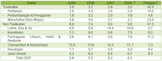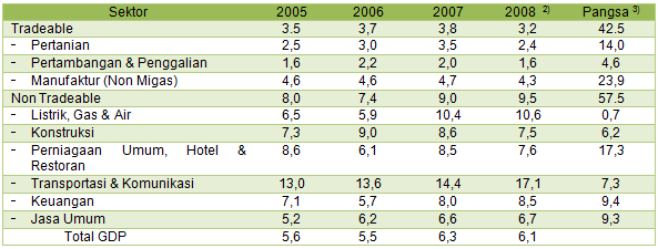 Seharusnya sektor tradeable inilah yang mendorong laju pertumbuhan ekonomi Indonesia, karena selain menghasilkan komoditi/produk yang dapat dijual, juga mampu menyerap tenaga kerja yang lebih banyak. Sub sektor ekonomi manufaktur non migas, walaupun pangsanya 23,9 % terhadap keseluruhan sektor ekonomi (lihat Tabel 4), namun tingkat pertumbuhannya relatif kecil rata-rata 4,6 %/tahun selama kurun waktu 2005 s/d 2007, kemudian pada tahun 2008 (s/d kuartal 3) mencapai 4,3 %. Demikian pula untuk sub sektor pertanian, walaupun pangsanya mencapai 14,0 %, namun pertumbuhannya tidak mengembirakan.