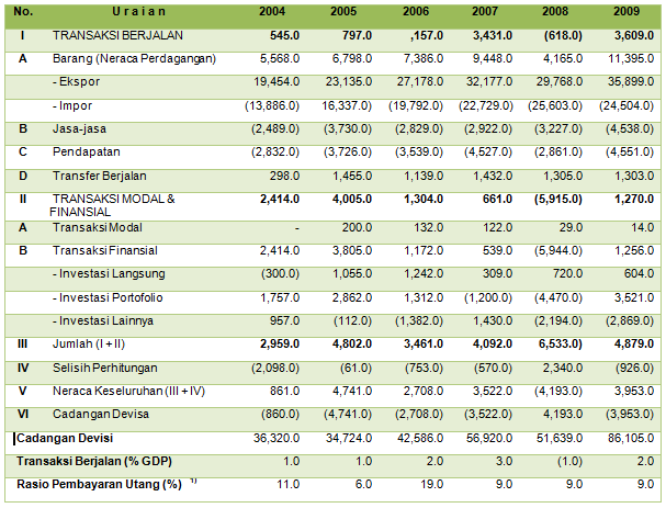 Indikator berikutnya adalah perkembangan ekspor-impor, selama periode 2004 – 2009 mengalami peningkatan cukup berarti terutama ekspor, dengan laju pertumbuhan rata-rata 15,40 %/tahun selama periode tersebut, sementara impor hanya tumbuh rata-rata 13,04 %/tahun, sehingga Neraca Perdagangan selalu dalam kondisi surplus relatif lebih besar dibandingkan transaksi lainnya; Dan ini menyebabkan Transaksi Berjalan selalu surplus, kecuali pada tahun 2008 (lihat Tabel 3), kendati rasio-nya terhadap GDP rata-rata hanya 1,3 %, akan tetapi turut memberikan andil terhadap pembentukan Cadangan Devisa, dimana dalam periode waktu yang sama mampu tumbuh sebesar 18,84 %/tahun, yang sebagian besar disumbangkan oleh Transaksi Modal & Finasial, terutama dari Investasi Portofolio, baik portofolio pasar uang maupun pasar modal.